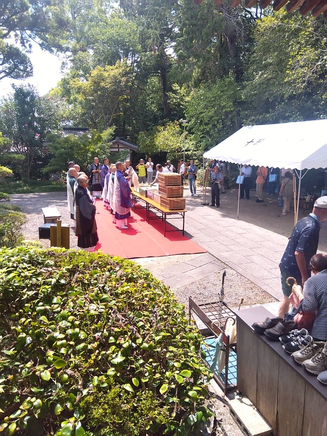 例年であれば、法要のあとに金魚を池へ放つ場面がありますが、今年は池が渇水しており放生できませんでした。